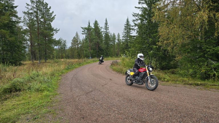 Lämplig MC är princip alla MC som klarar att köra touring på grus och som du känner dig komfortabel med på grusväg (vilket i stort sett är alla). Lämpliga däck kan vara Michelin Anakee, Metzeler Tourance, Heidenau K60 och liknande, men det går också bra med grövre däck som Continental TKC80 eller Metzeler Karoo men det är absolut inte nödvändigt. Funkar även med rena landsvägsdäck, det är bara att sänka trycket något för att det ska kännas tryggt. Vi som guidar kommer att ha med enklare verktyg, punkteringslagning, pump, startkablar och reservdunk. Vi har även med första förband och enklare smärt- och resemediciner utifall olyckan skulle vara framme. Det finns också en enklare verkstad på plats i Gagnef om det skulle behövas.