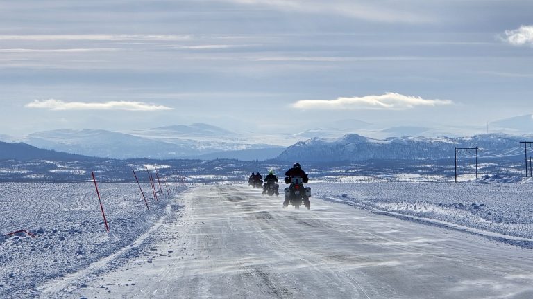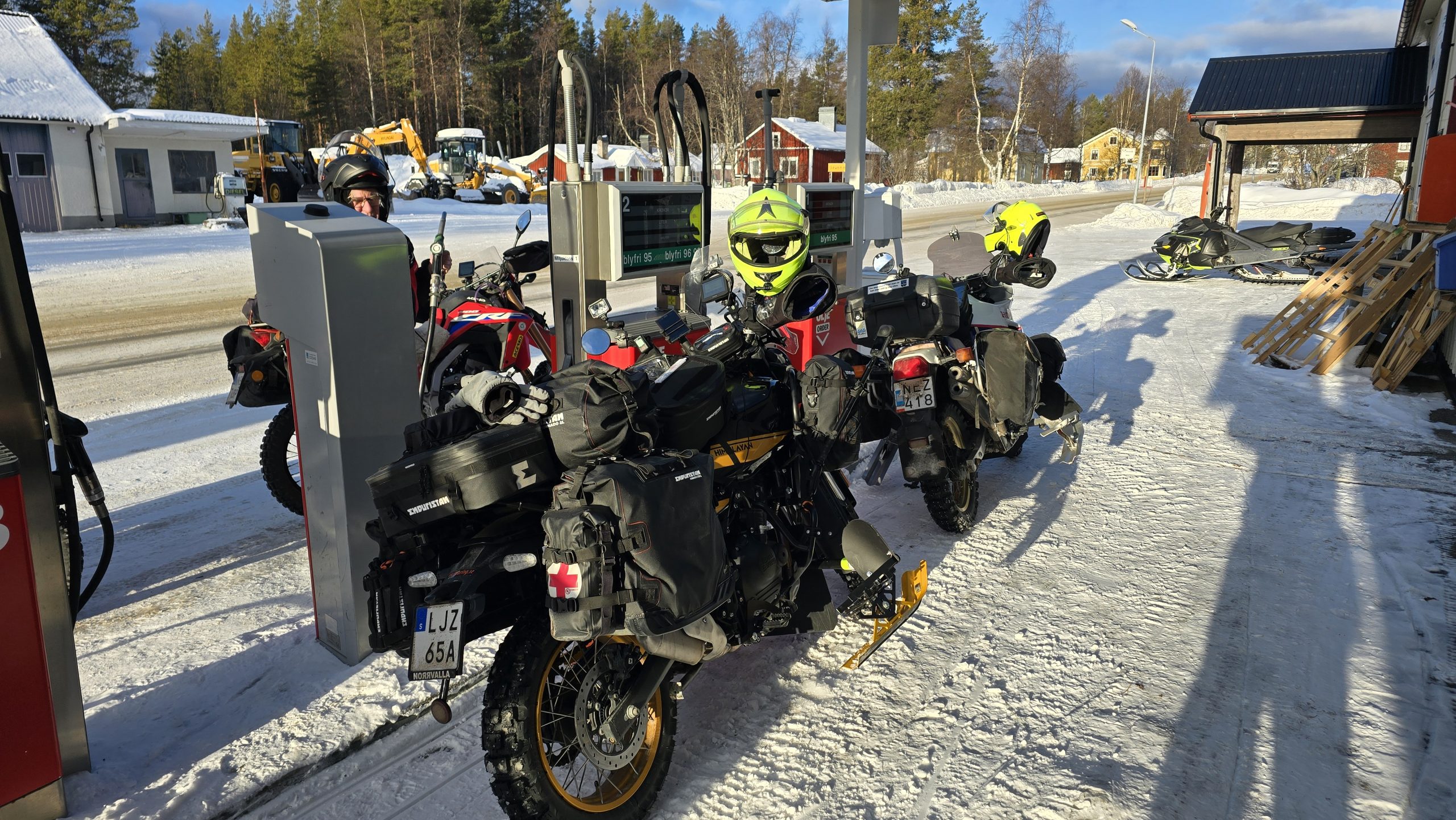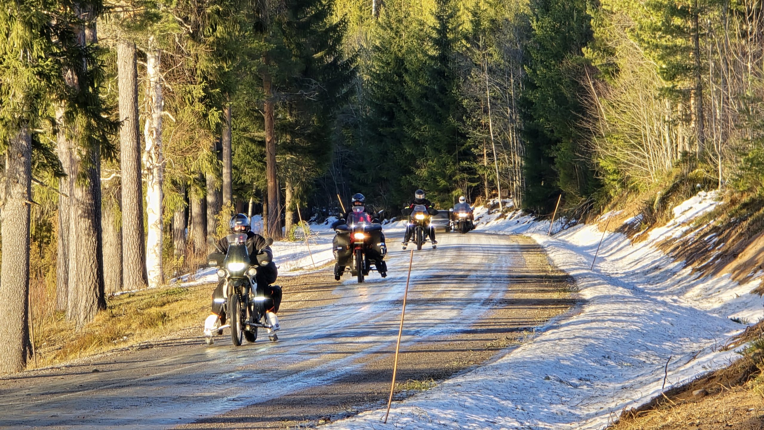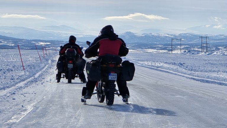 Din MC ska vara utrustad med dubbdäck (helst bildubb max 2 mm). Lämpligen kompletteras kort dubb(bildubb) med skidor alternativt sidvagn som gör det enklare att ta sig fram i fall det skulle komma mycket snö eller det är riktigt spårigt. Med lång dubb (typ endurodubb) kan det bli besvärligt om det blir långa sträckor med bar asfalt men vi försöker så långt det är möjligt att minimera sådana vägval. Erfarenhet från tidigare resor ger att det brukar finnas åtminstone is och snösträngar att hålla sig till om asfalten börjar krypa fram, men det har hänt att vi kört över fjäll där det varit barmark. På vägar med grusunderlag har vi sällan sett barmark men det kan vara rejält isigt. Har du sidvagn funkar det bäst med kort dubb men även här kan det gå bra med lång dubb om underlaget tillåter. För den som så önskar kan vi hjälpa till både med däcksval och dubbning om du är ute i god tid före resan. Vi från mctouring.se kommer att ha med förstaförband, enklare resemedicin, verktyg, däcklagning, slang, pump, extra starthjälp, snökedjor, bogserlina och lite andra nyttiga saker ifall något går sönder eller helt enkelt inte vill starta. Vi kommer också senare att presentera mer information runt både personlig utrustning och lösningar för din MC för att få ut det bästa möjliga av resan.